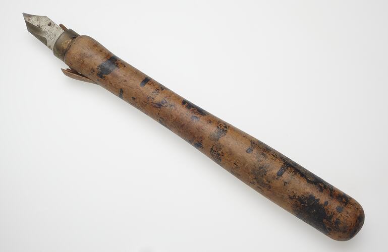 Tool with long wooden handle, rounded in shape. Brass ferrule holds short blade of grey metal at one end, which has been sharpened on one side and ends in a severe point. The handle is quite worn and tarnished with black marks.