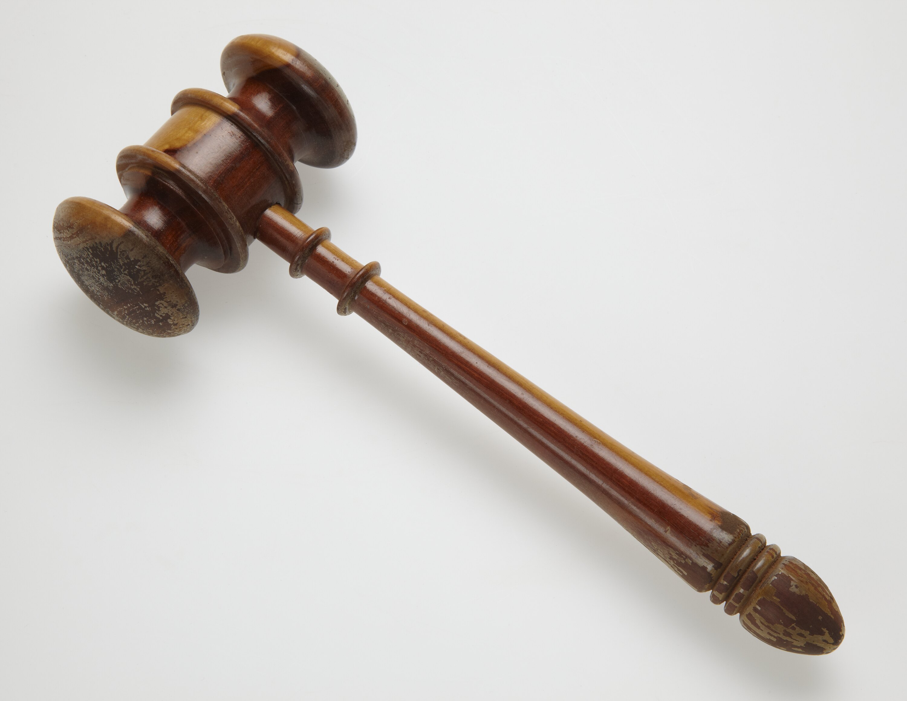 Lacquered wooden hammer, round handle wider at end, thin near head. Three thin grooves around end of handle, two rings near head. Head symmetrical, either side of centre part, same width as ends; ring either side of centre part. Light and dark coloured wood.