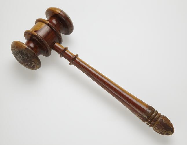 Wooden Mallet circa 1934-1990, taken from Area A at Adolph Bruhn & Son's Wood Turners Shop, 283 Coventry Street, South Melbourne. The business was established by Adolph Bruhn circa 1893 in Little Collins Street, Melbourne. Upon his death in 1919 it was then operated by Adolph's son Sophus Christopher Bruhn. Upon Sophus's death in 1959 his son Sophus Walter Bruhn took over the business. In 1970 Sophus reduced the scale of the business and relocated to South Melbourne. The business closed upon Sophus's death in January 1990.