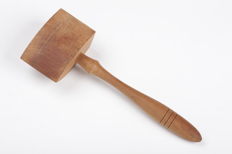 Wooden Mallet made by Adolph Bruhn & Son, circa 1970 - 1985. It was taken from Area A at Adolph Bruhn & Son's Wood Turners Shop, 283 Coventry Street, South Melbourne. The business was established by Adolph Bruhn circa 1893 in Little Collins Street, Melbourne. Upon his death in 1919 it was then operated by Adolph's son Sophus Christopher Bruhn. Upon Sophus's death in 1959 his son Sophus Walter Bruhn took over the business. In 1970 Sophus reduced the scale of the business and relocated to South Melbourne. The business closed upon Sophus's death in January 1990.