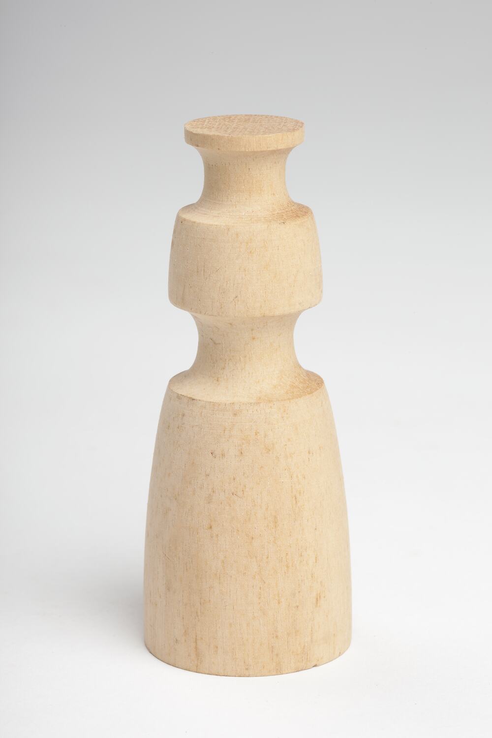Triangular chess piece made from one solid block of cream coloured wood. Two wide grooves are present in the top half of the object.