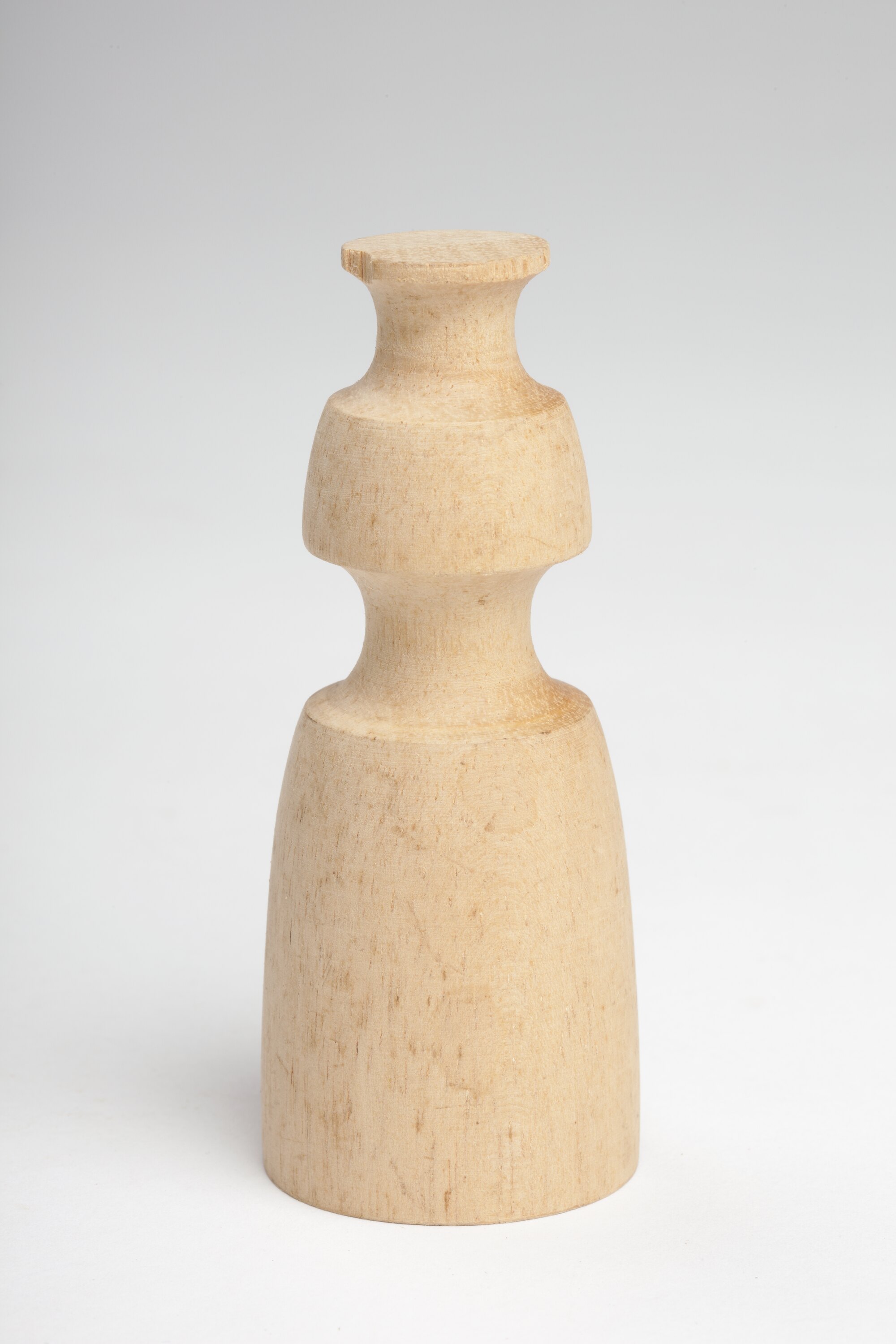 Triangular chess piece made from one solid block of cream coloured wood. Two wide grooves are present in the top half of the object.