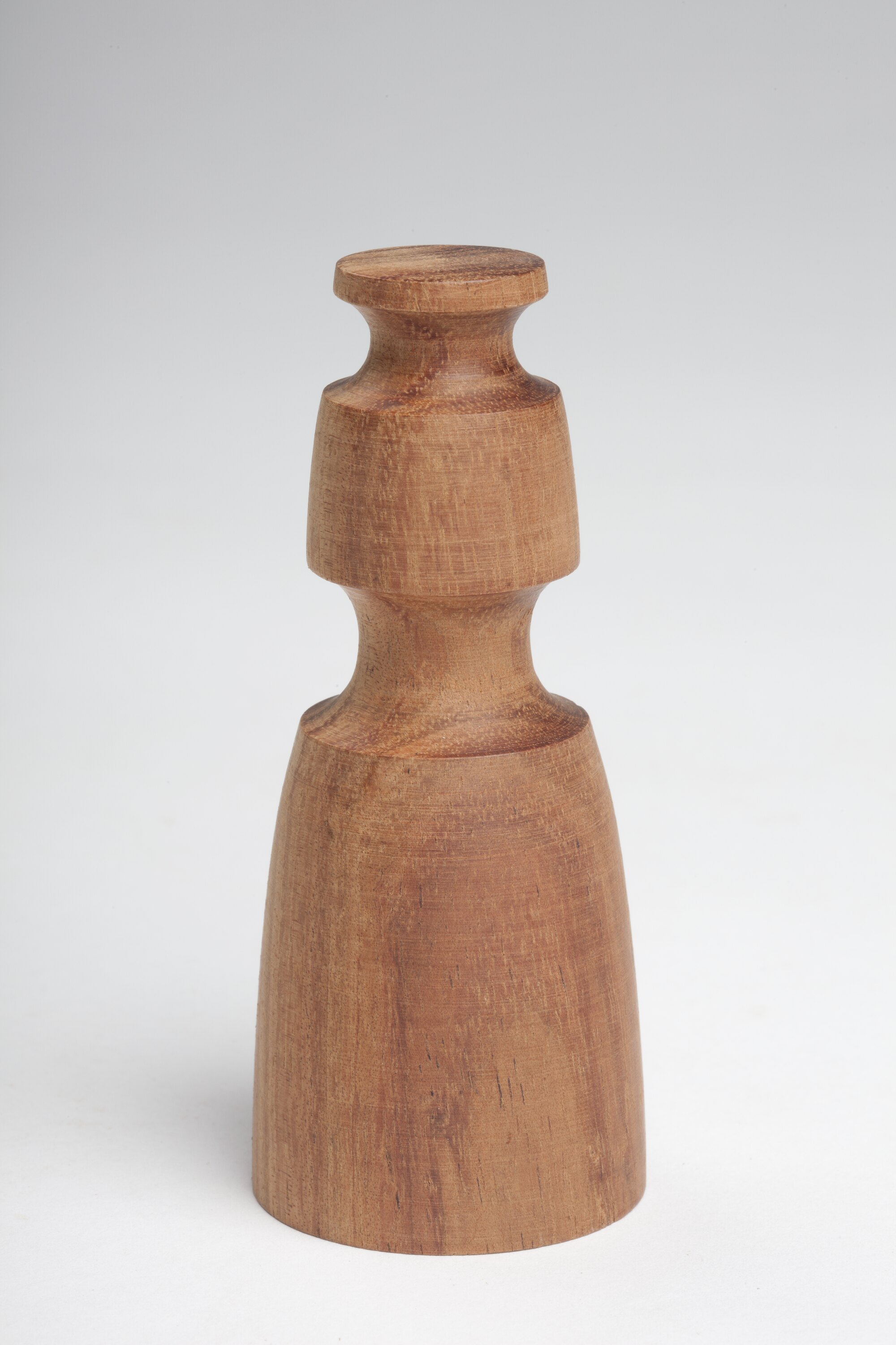 Triangular chess piece made from one solid block of fawn coloured wood. Two wide grooves are present in the top half of the object. A wooden protrusion is present in the centre of the item's base.