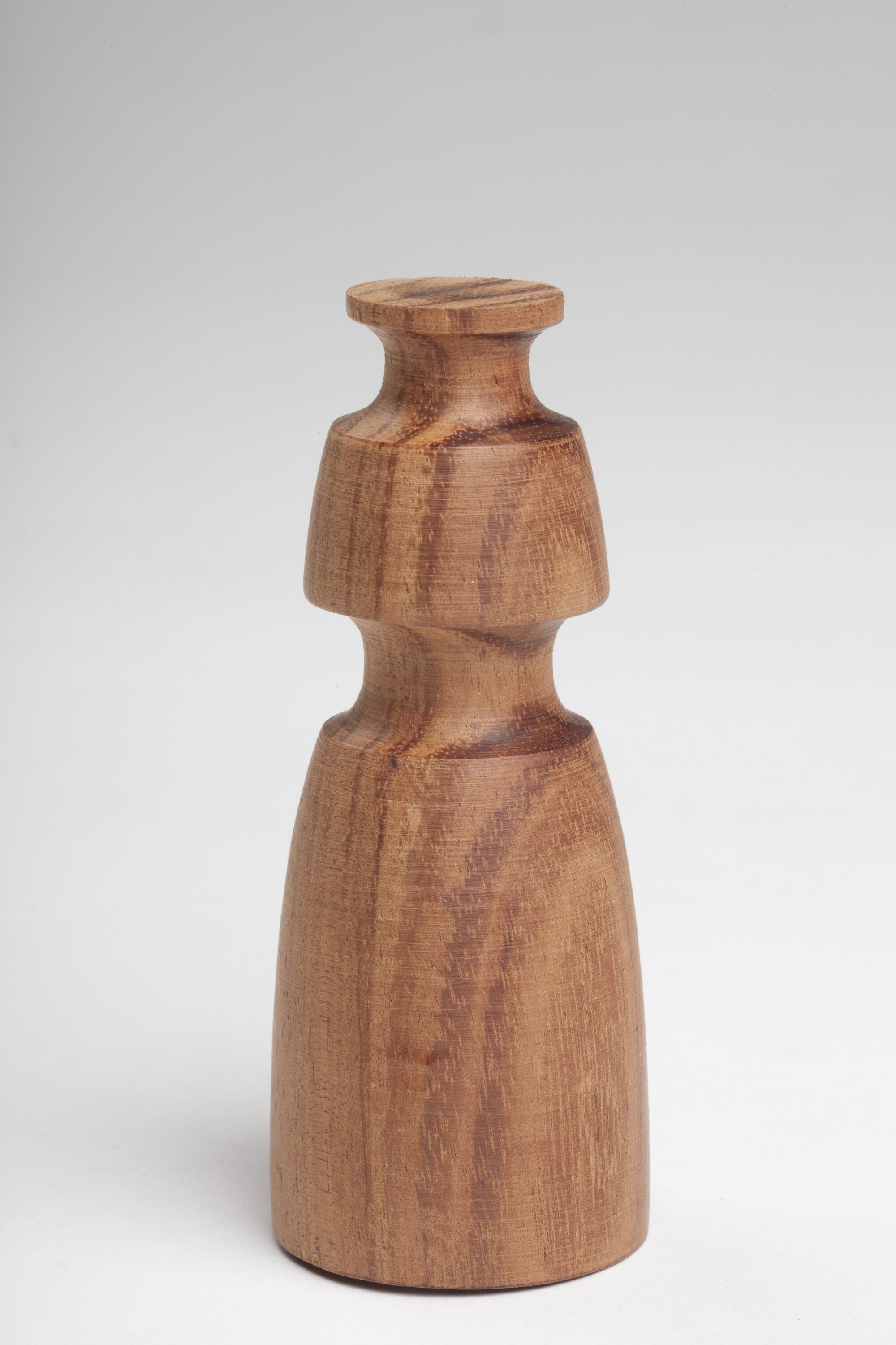Triangular chess piece made from one solid block of fawn coloured wood. Two wide grooves are present in the top half of the object. A wooden protrusion is present in the centre of the item's base.