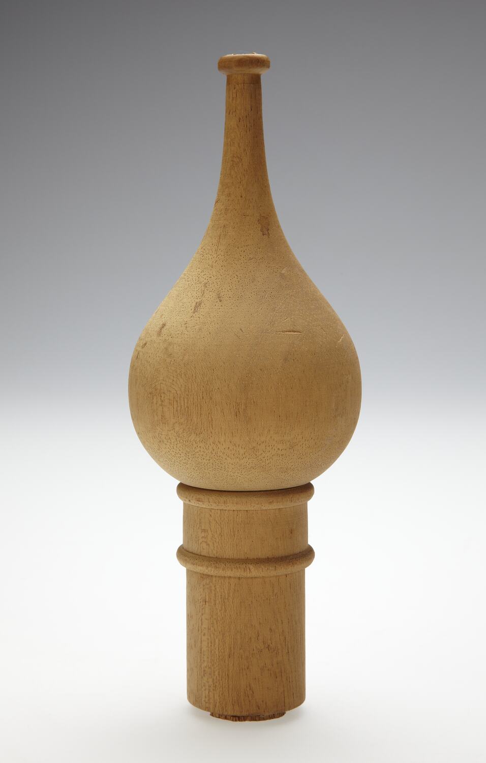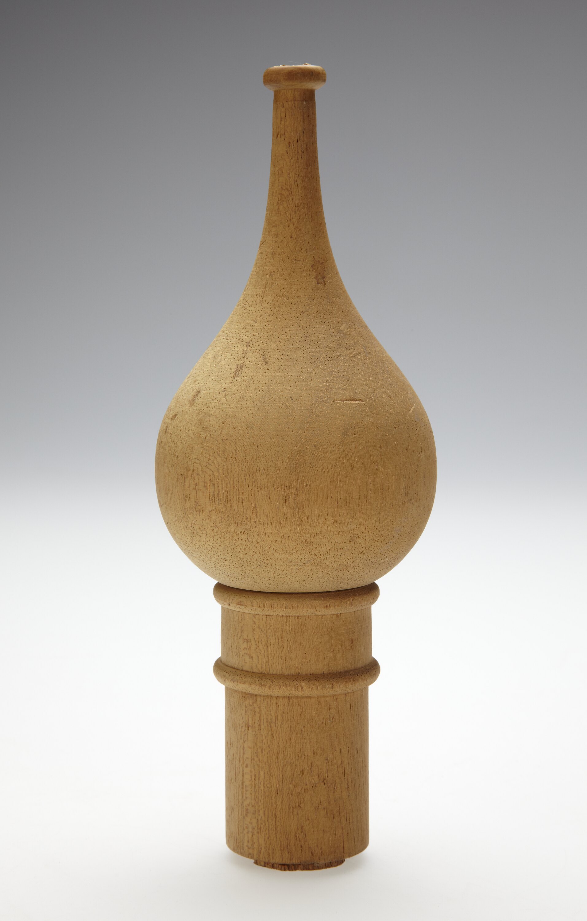 Item is made from a solid piece of pale golden wood and is shaped like the dome of a Muslim mosque (ie. a ball tapering to a point set on top of a pillar-shaped piece of wood. Two raised ribs encircle the upper part of the wooden pillar. A hole has been bored into the centre of the item's base.