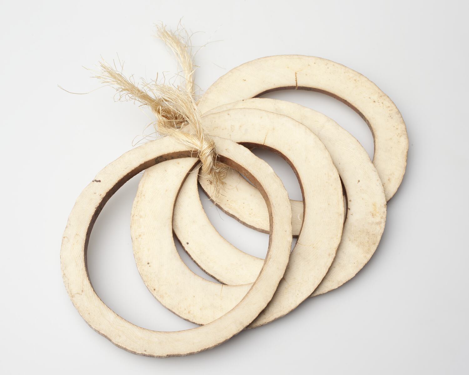 Large bangle-sized rings with crust on outside and a motley brown colour inside with grain running perpendicular to circumference. Sides are a dirty white colour with brown spots; smooth with marks of having been sanded. The four rings are joined together with a piece of string. Material is probably ivory or bone.
