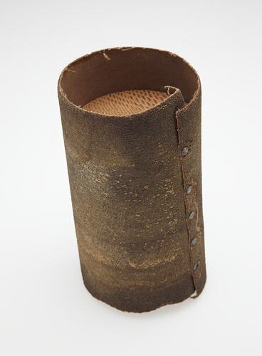 Cylindrical-shaped piece of wood with piece of dense, coarse dark sandpaper wrapped around it. Sandpaper is held in place with a row of five tacks and extends beyond length of wood at both ends.