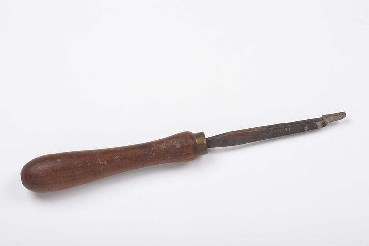 Scraper made by Fenn & Co circa 1890s-1950s. It was found in Area B1 at Adolph Bruhn & Son's Wood Turners Shop, 283 Coventry Street, South Melbourne. The business was established by Adolph Bruhn circa 1893 in Little Collins Street, Melbourne. Upon his death in 1919 it was then operated by Adolph's son Sophus Christopher Bruhn. Upon Sophus's death in 1959 his son Sophus Walter Bruhn took over the business. In 1970 Sophus reduced the scale of the business and relocated to South Melbourne. The business closed upon Sophus's death in January 1990.