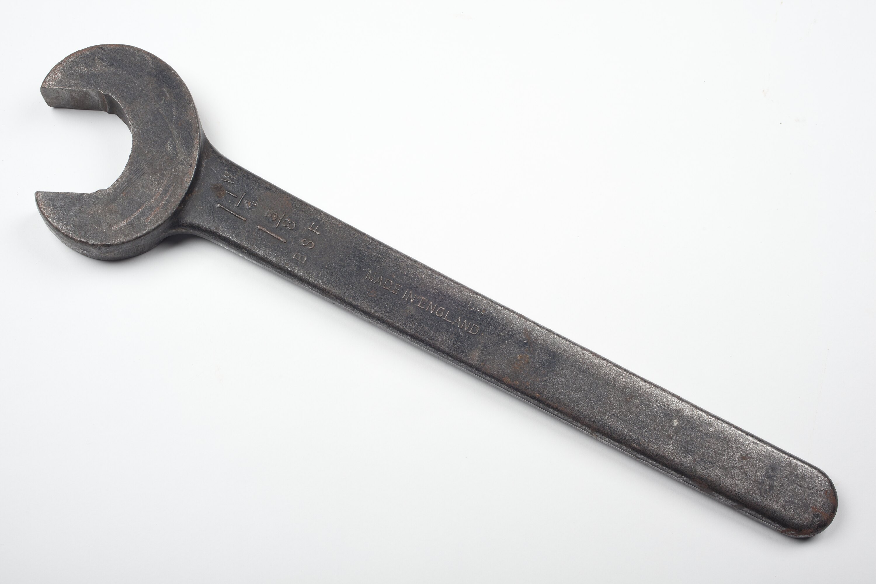 Large, heavy spanner made from grey metal.