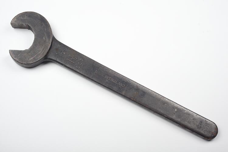 Large spanner circa 1900 - 1980, it was found on top of the band saw in Area D2 at Adolph Bruhn & Son's Wood Turners Shop, 283 Coventry Street, South Melbourne. The business was established by Adolph Bruhn circa 1893 in Little Collins Street, Melbourne. Upon his death in 1919 it was then operated by Adolph's son Sophus Christopher Bruhn. Upon Sophus's death in 1959 his son Sophus Walter Bruhn took over the business. In 1970 Sophus reduced the scale of the business and relocated to South Melbourne. The business closed upon Sophus's death in January 1990.