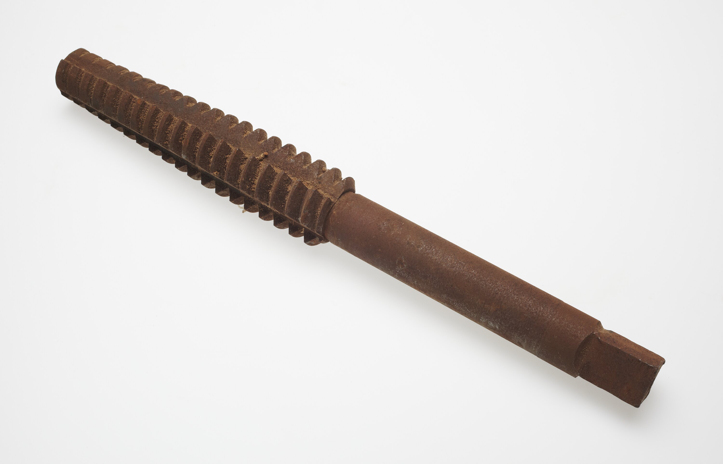 Metal tool used for forming threads inside a wooden dowel (i.e. internal threads). A cylinder of heavy metal with four rows of vertical serrated metal teeth is at the top of the cylinder. Each row has nineteen teeth. The cylinder taper slightly towards the top.