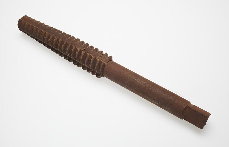 Tap made circa 1960s-1980s. It was used for cutting internal metal threads. It was found in Area E3 at Adolph Bruhn & Son's Wood Turners Shop, 283 Coventry Street, South Melbourne. The business was established by Adolph Bruhn circa 1893 in Little Collins Street, Melbourne. Upon his death in 1919 it was then operated by Adolph's son Sophus Christopher Bruhn. Upon Sophus's death in 1959 his son Sophus Walter Bruhn took over the business. In 1970 Sophus reduced the scale of the business and relocated to South Melbourne. The business closed upon Sophus's death in January 1990.