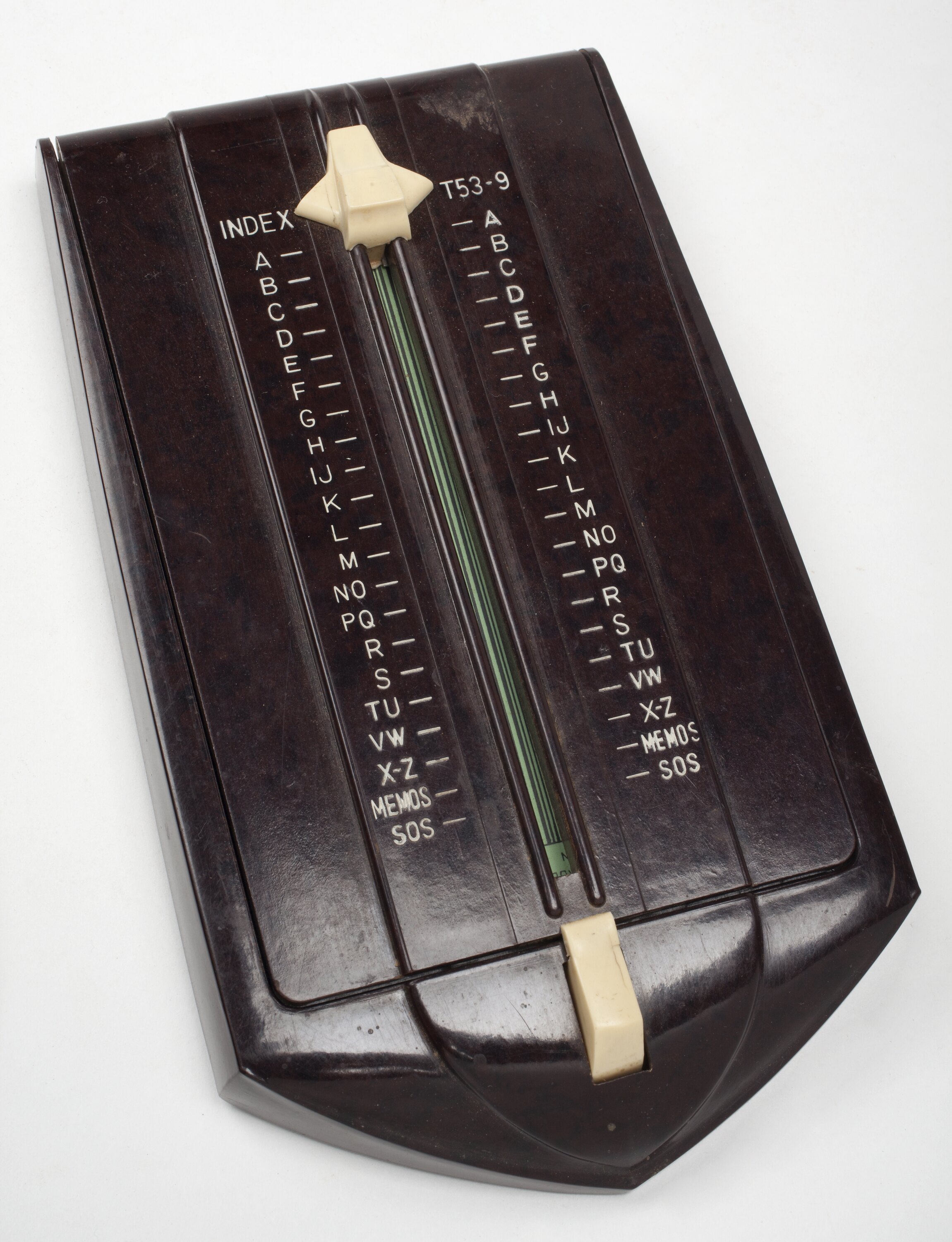 A pop-up telephone index made of dark brown plastic with white lettering and attachments. Rectangular in shape, slightly wider and coming down to a point at one end.