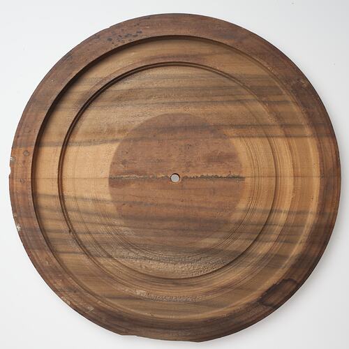 Object is made from chestnut gold- and dark-coloured wood which is arranged in a linear pattern. Object is shaped like a large, shallow dish except that inside it is grooved producing central and peripheral raised areas as opposed to a concave surface. The sides are sloped and a circular hole penetrates the centre of the item. Two symmetrical semi-circular pieces of wood have been glued together.