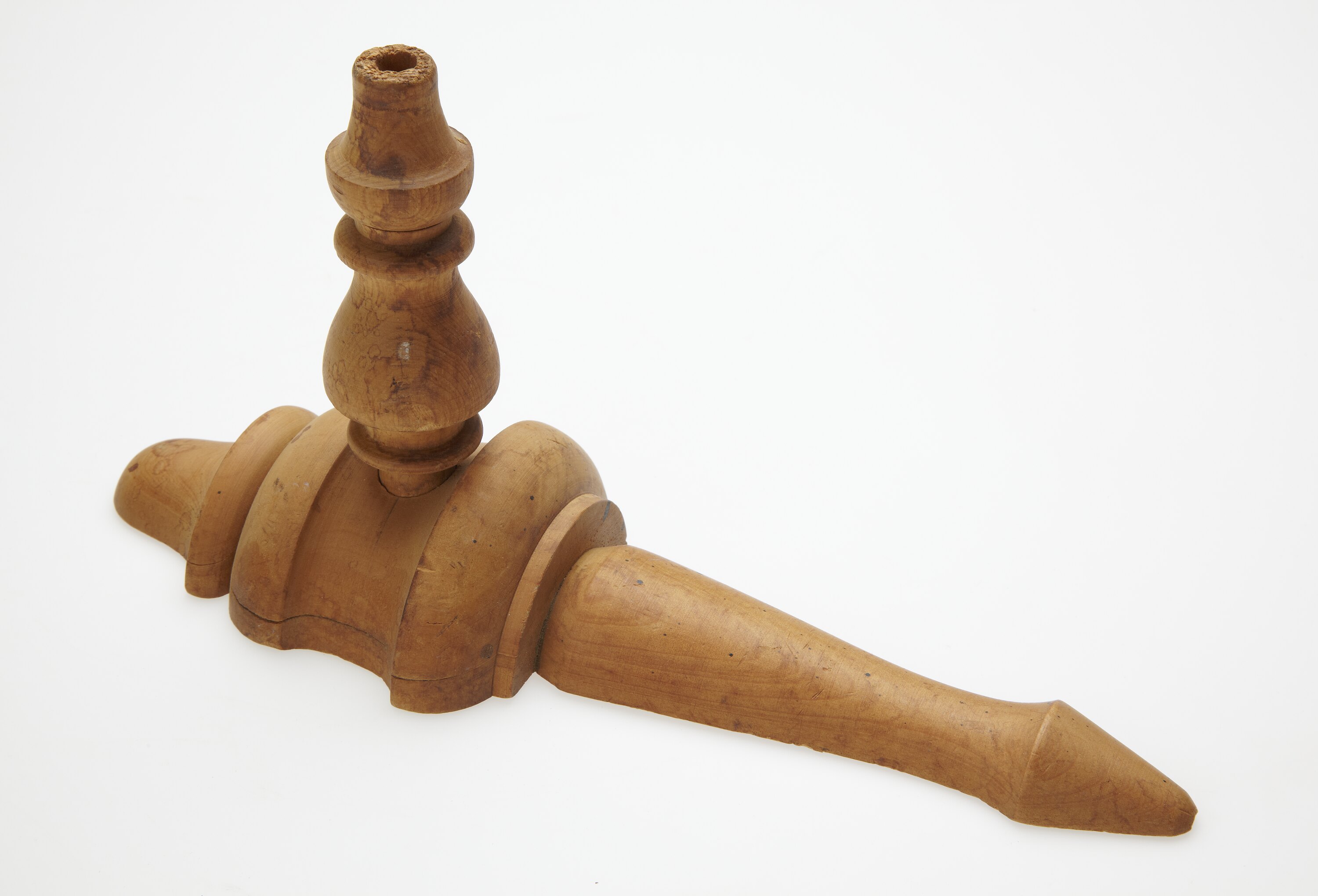 Hanger made from gold-coloured wood. Front is elaborately turned and is thickest in the centre, tapering to a point at both ends. A separate, elaborately turned piece is inserted into a hole situated in a groove in the centre of the body. This hanger projects at right angles to the body. The back of the object is flat with a metal device (for hanging the object on a wall) attached to a circular depression in the wooden surface. Directly below this is a larger circular depression which holds the wooden hanger.