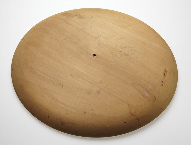 Large, shallow dish made from a pale golden coloured wood. Fairly plain, simple appearance. Decoration consists of two grooves encircling the rim of the dish. Writing on base of item. Appears to have been made from two separate pieces of wood as indicated by join present along one side of dish. Hole bored into centre of dish base.