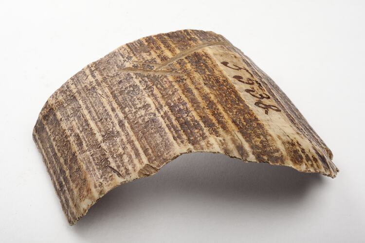 Curved piece of ivory with one sawn, straight end, two sawn, straight sides and one ragged end. Outer convex surface has cream and brown vertical striations running across the surface. A number has been written onto a shaved area near one side and several thick diagonal slashes are present in the surface. Inner concave surface is smooth and dark brown in colour.