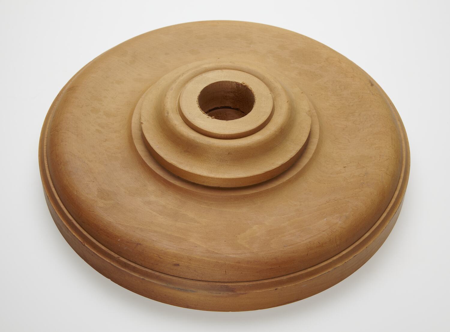 Broad, shallow base made from rich gold-coloured wood. Base has raised, tiered, circular section in its centre. A hole is situated in the centre of this circular section. The rim of the base is grooved.