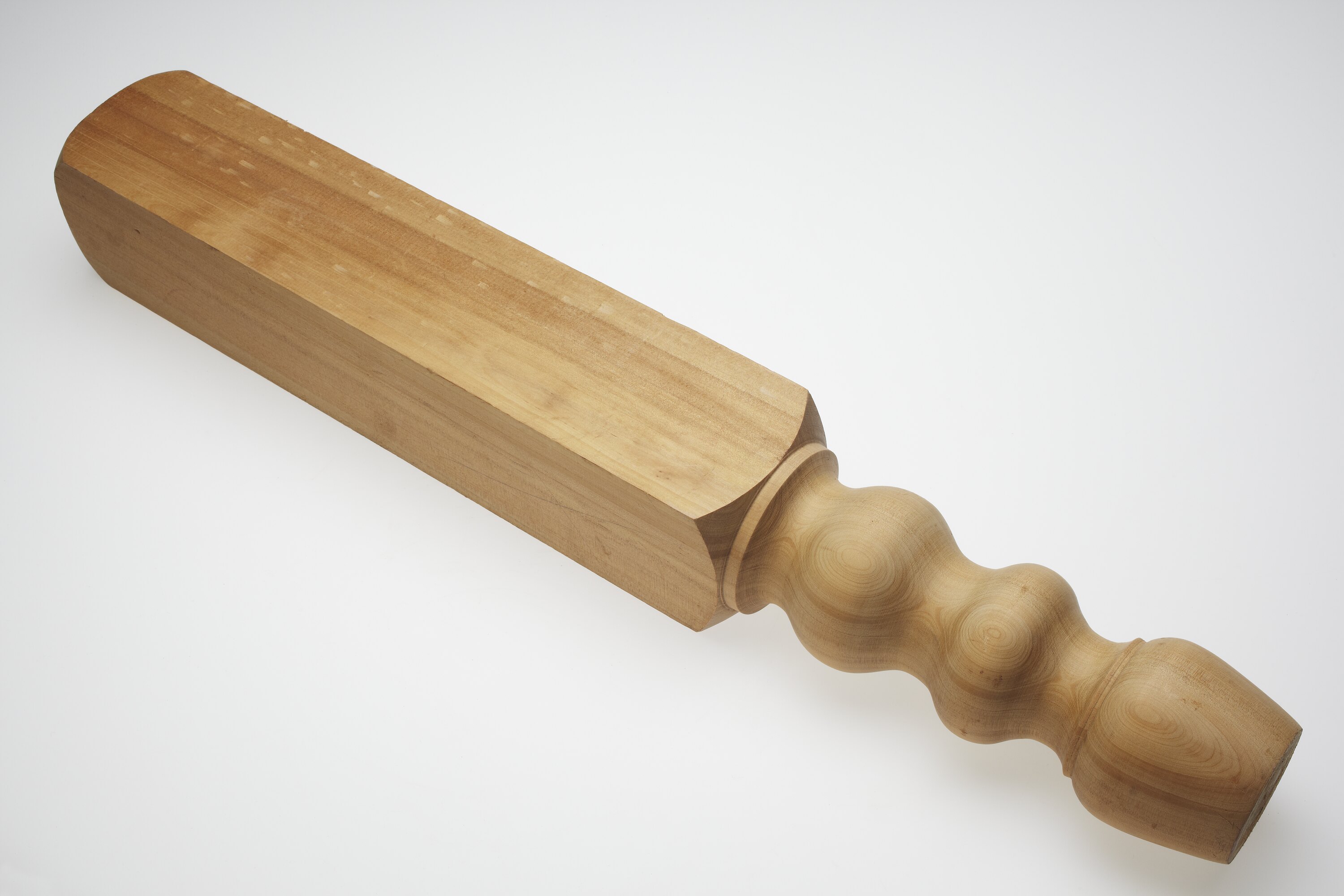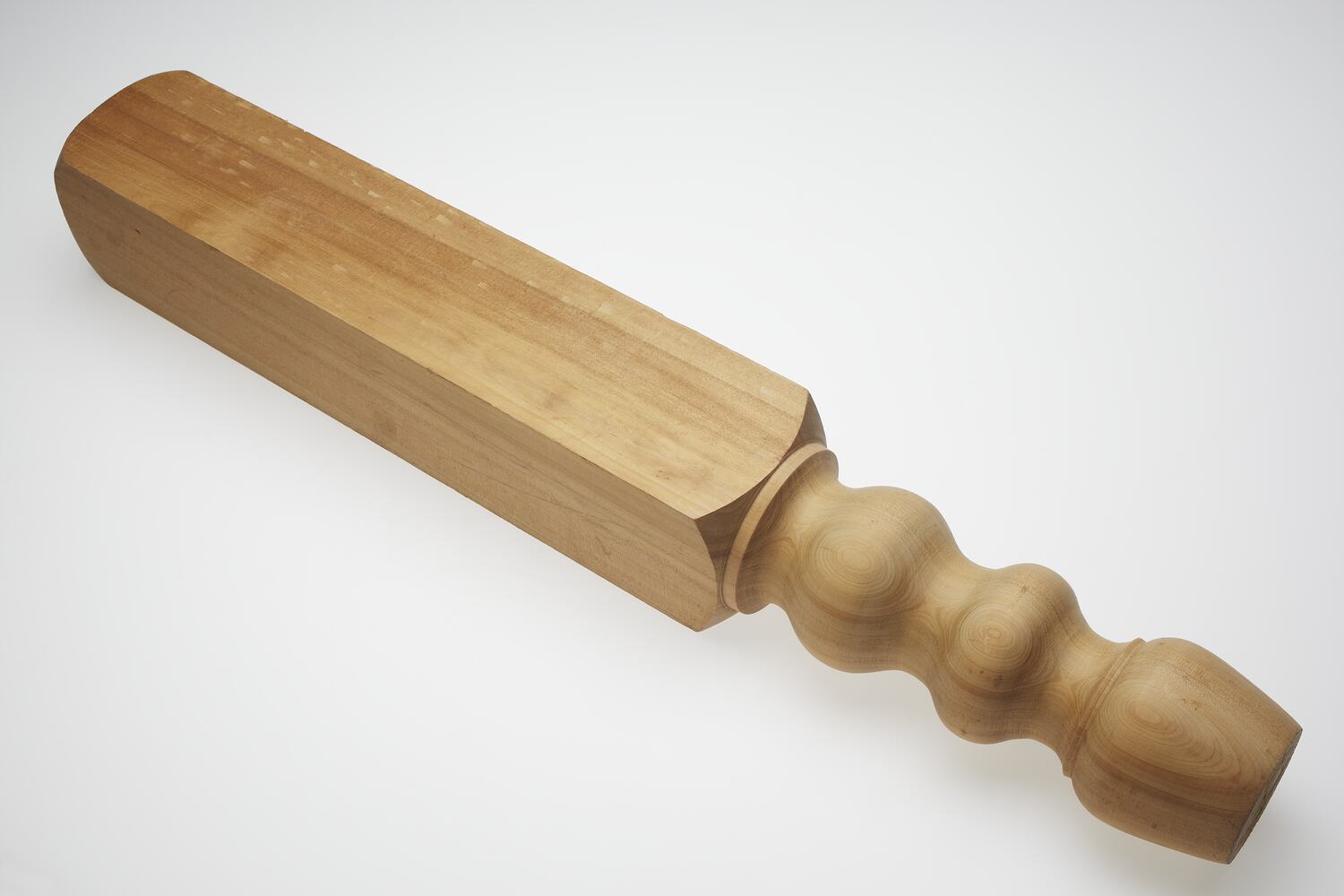 Furniture leg made from pale coffee- and cream-coloured wood with a pronounced wood grain. The bottom section of the leg is composed of three bulbous forms separated by wide grooves. The upper section is rectangular. The bottom end is flat and has a rough piece of wood projecting from the centre extending 4.5cm. into the body.