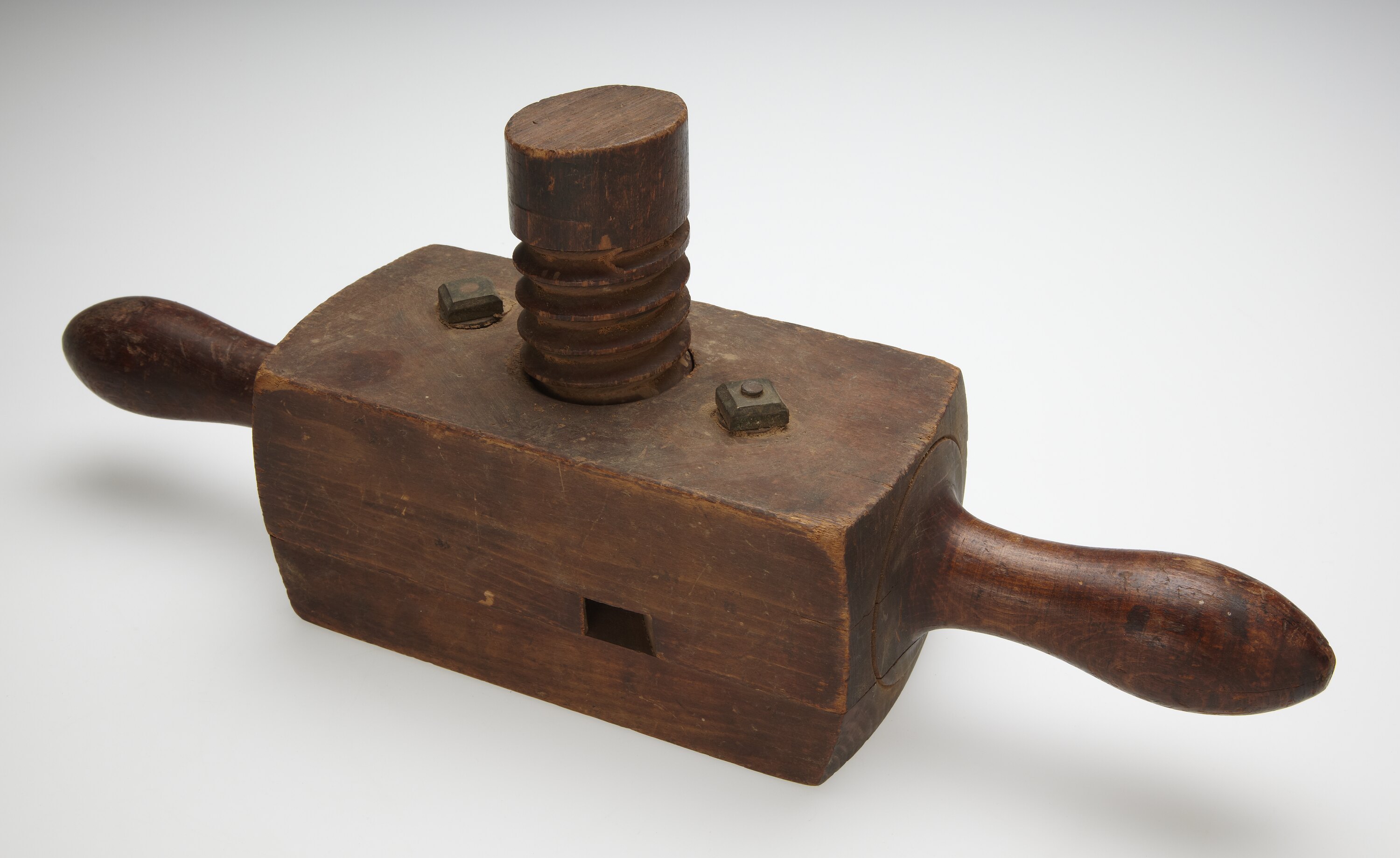 Polished wooden box of two sections bolted together, with turned handles either end, and small rectangular, angled cut-outs either side, where blades (or thread cutters) are lodged. Internal threaded hole. Circular wooden screw with smooth circular handling area.