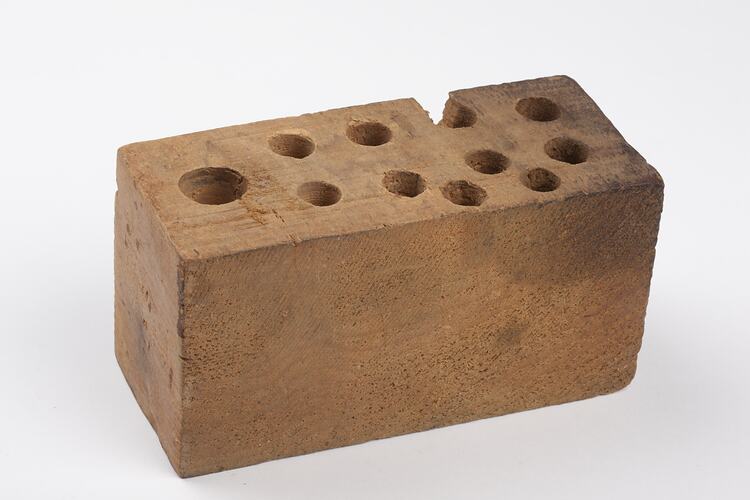 Wooden block with eleven drilled holes of different diameters.