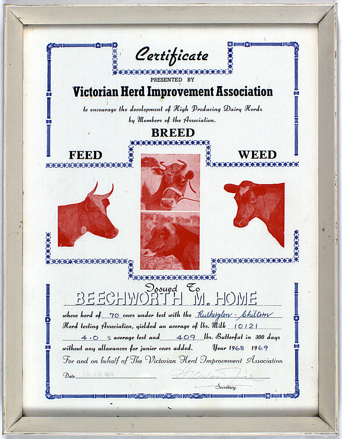 Framed certificate issued for high production of dairy herds. Certificate is white with black print, and a blue border pattern. There are four red coloured photographs of dairy cows. Issued by the Victorian Herd Improvement Association.