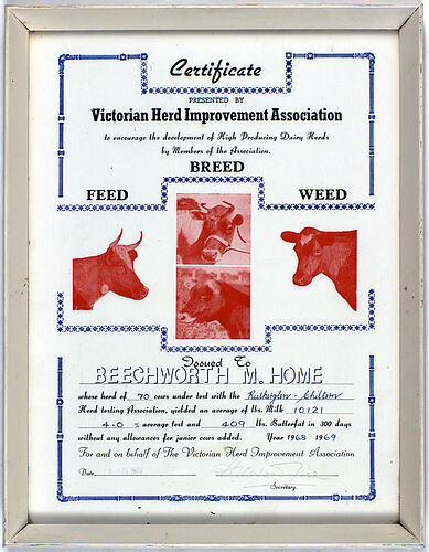 Framed certificate from Victorian Herd Improvement Association awarded to Beechworth Mental Home, a mental health hospital in Beechworth, Victoria, Australia, circa 1969. Beechworth Mental Home, and other country institutions, undertook extensive farming on their properties. They produced fresh fruit, vegetables, milk and meat for consumption and also for sale. Some patients worked on the farms and gardens for extra rations.