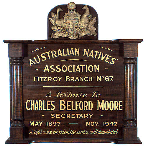 Text: AUSTRALIAN NATIVES'/ASSOCIATION/FITZROY BRANCH No. 67/A Tribute To/CHARLES BELFORD MOORE - SECRATARY - May 1897 - Nov. 1942 / A Life's work in friendly service, well remembered'.