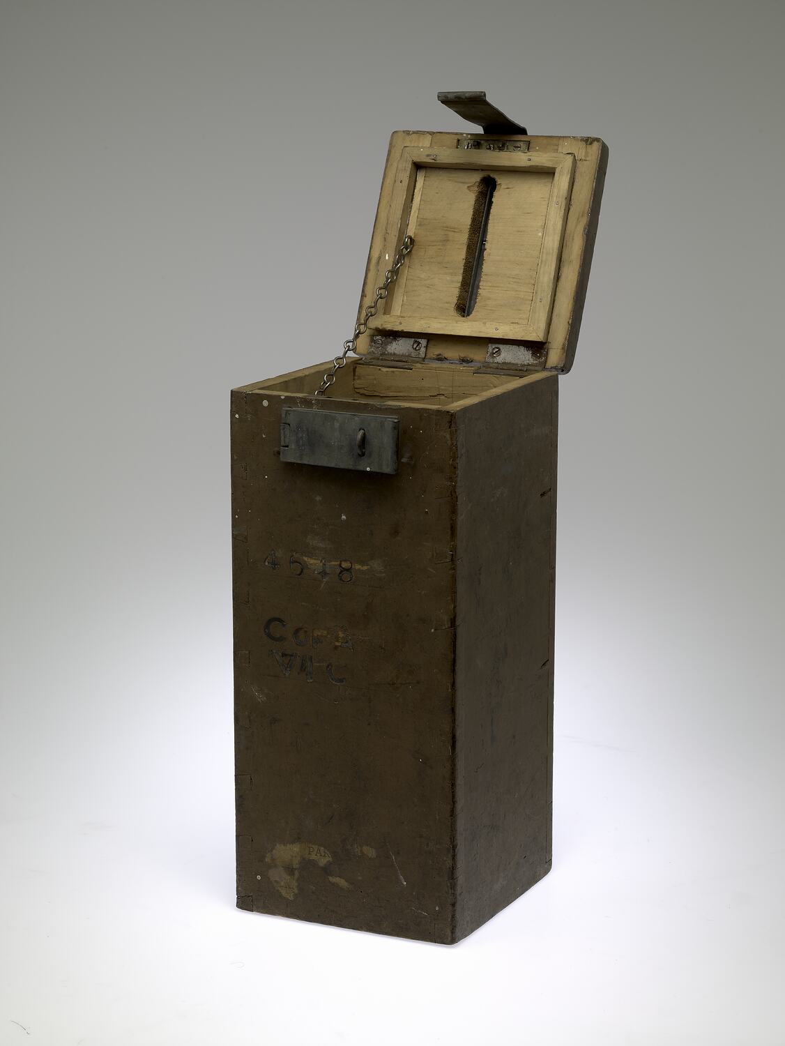 Wooden ballot box, circa 1900s-1930s. Wooden ballot boxes were phased out in favour of metal ones sometime before the 1970s, then plastic was experimented with before the electoral authorities moved onto cardboard in the mid 1980s. The 'C of A' on the front of the box dates it to the early 20th Century, it is believed that state electoral authorities shared electoral equipment at this time. The ballot box suggests the activity of voting and the possibilities voters have to influence the political direction of the nation.