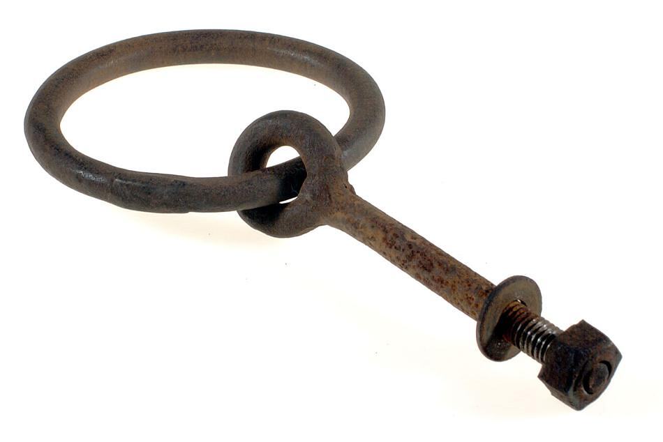 Metal ring with large bolt forged to form loose attaching ring. Bolt is threaded at end with washer and screw attached. Evidence of rust.