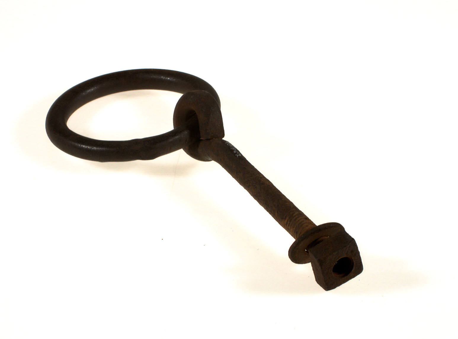 Metal ring with large bolt forged to form loose attaching ring. Bolt is threaded at end with washer and screw attached. Evidence of rust.