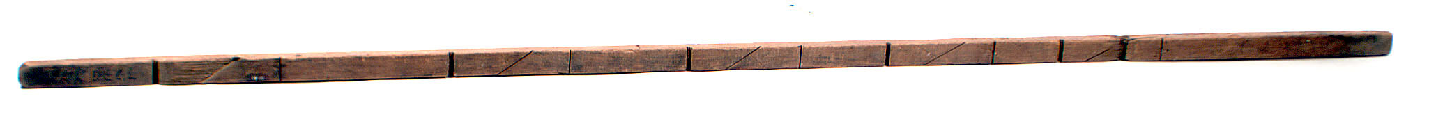 Long, narrow piece of timber with horizontal and diagonal notches of varying widths, depths and spacing cut into it. One edge has been painted light brown.
