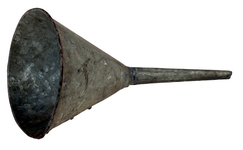 Galvanised metal funnel, possibly hand-made. Possibly used for funnelling oil or petrol into engines. Used at Newmarket Saleyards.