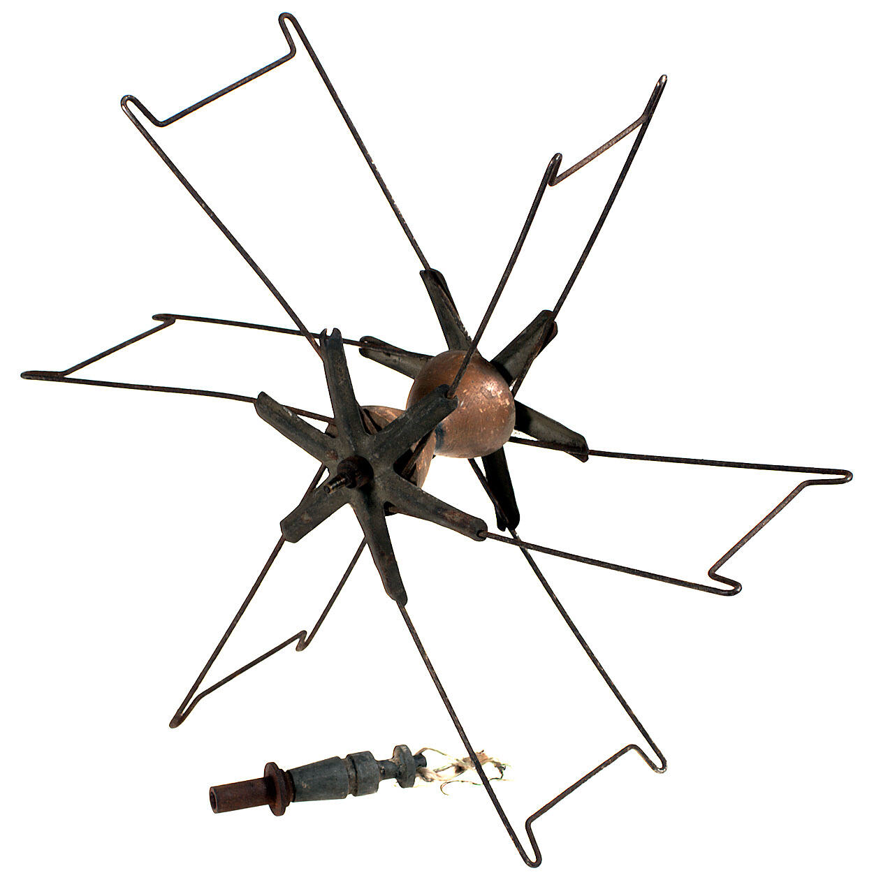 Wool winder made of wood and metal. The winder would have been supported at the centre during operation - possibly with the use of the separate metal shaft, one end of which might have been placed over the pin at the centre of the spindle, and the other pushed into a corresponding hole in another object.