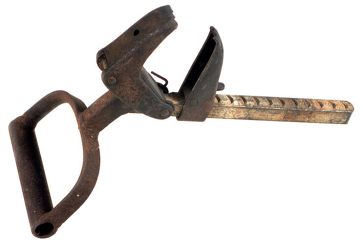 Metal gravity clamp for lifting and carrying timber. Used at Newmarket Saleyards by Melbourne City Council in repairing yards, fences and buildings.