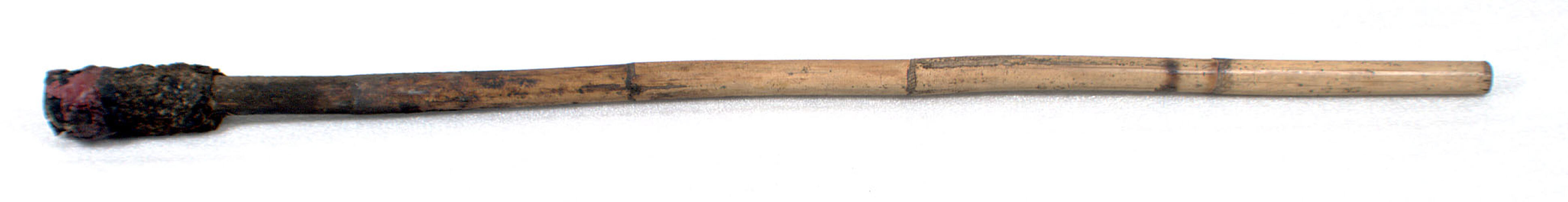 Long, cane stick with tar and paint at one end.