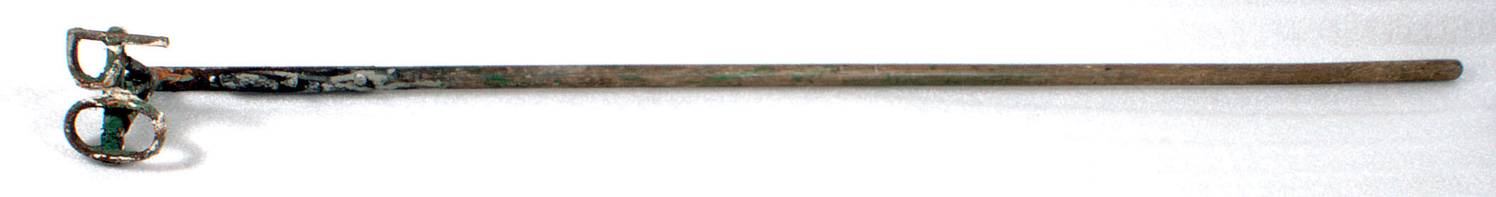 Cattle branding iron. Long wooden handle attached to a metal head with 2 bolts. The letters "P" and "O" have been welded onto a 3-pronged support.
