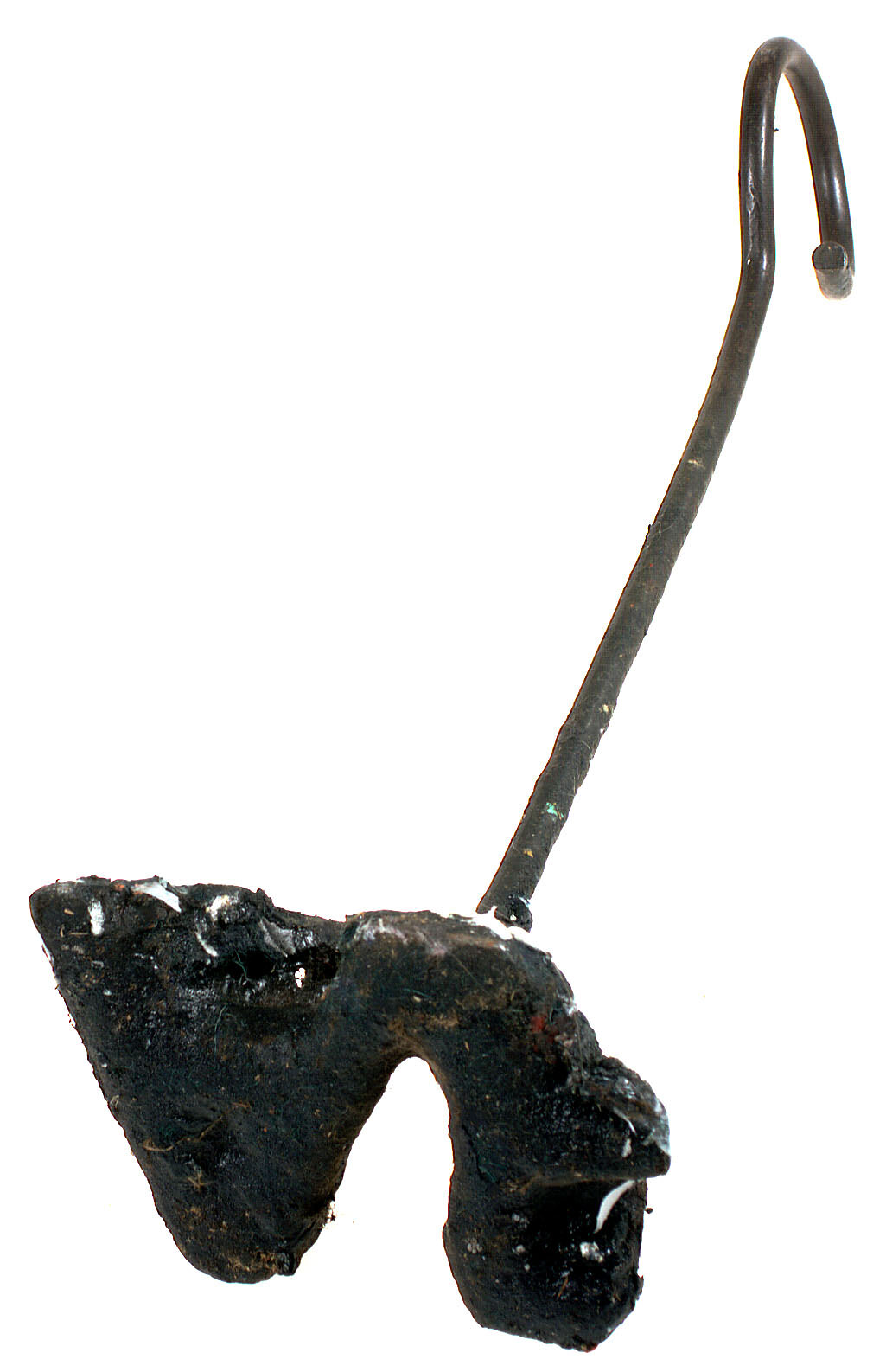 Cast metal sheep brand. Handle of rounded metal rod bent into a loop at one end to form a handle.