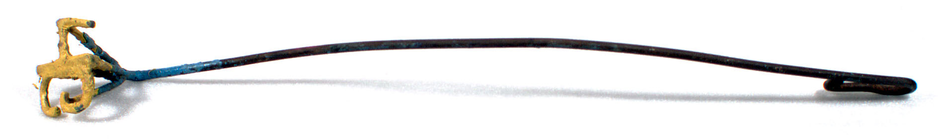 Cattle branding iron. Used with paint (pink then blue and later yellow). Welded metal consisting of a long shaft bent at one end to form a handle and welded to the head at the other. The brand head is supported by 5 shafts.
