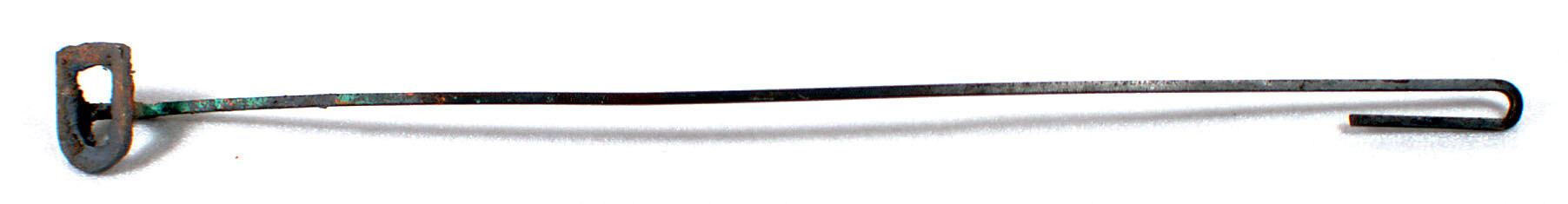 Cattle branding iron. Evidence of grey paint. Squared metal shaft is bent over at one end to form handle grip. Shaft is welded to top and bottom of "D".
