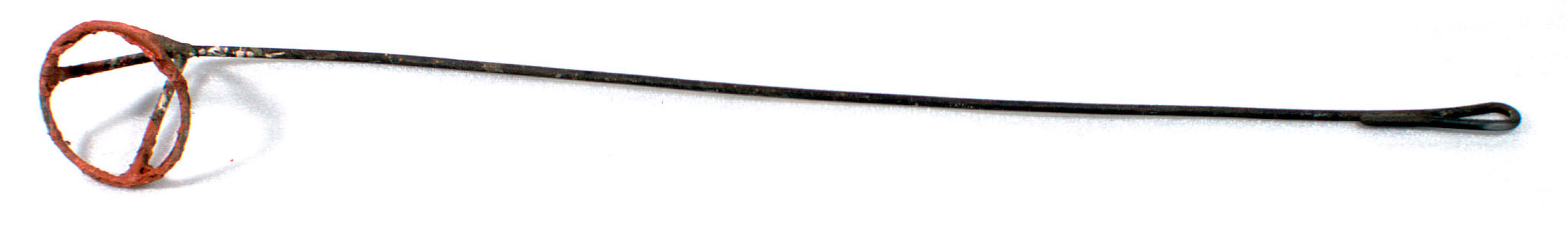 Cattle branding iron. Used with red paint. Welded metal, consisting of a long shaft folded over at one end to form a handle, and curving outwards towards the head, which is comprised of 3 support rods and a large "O".