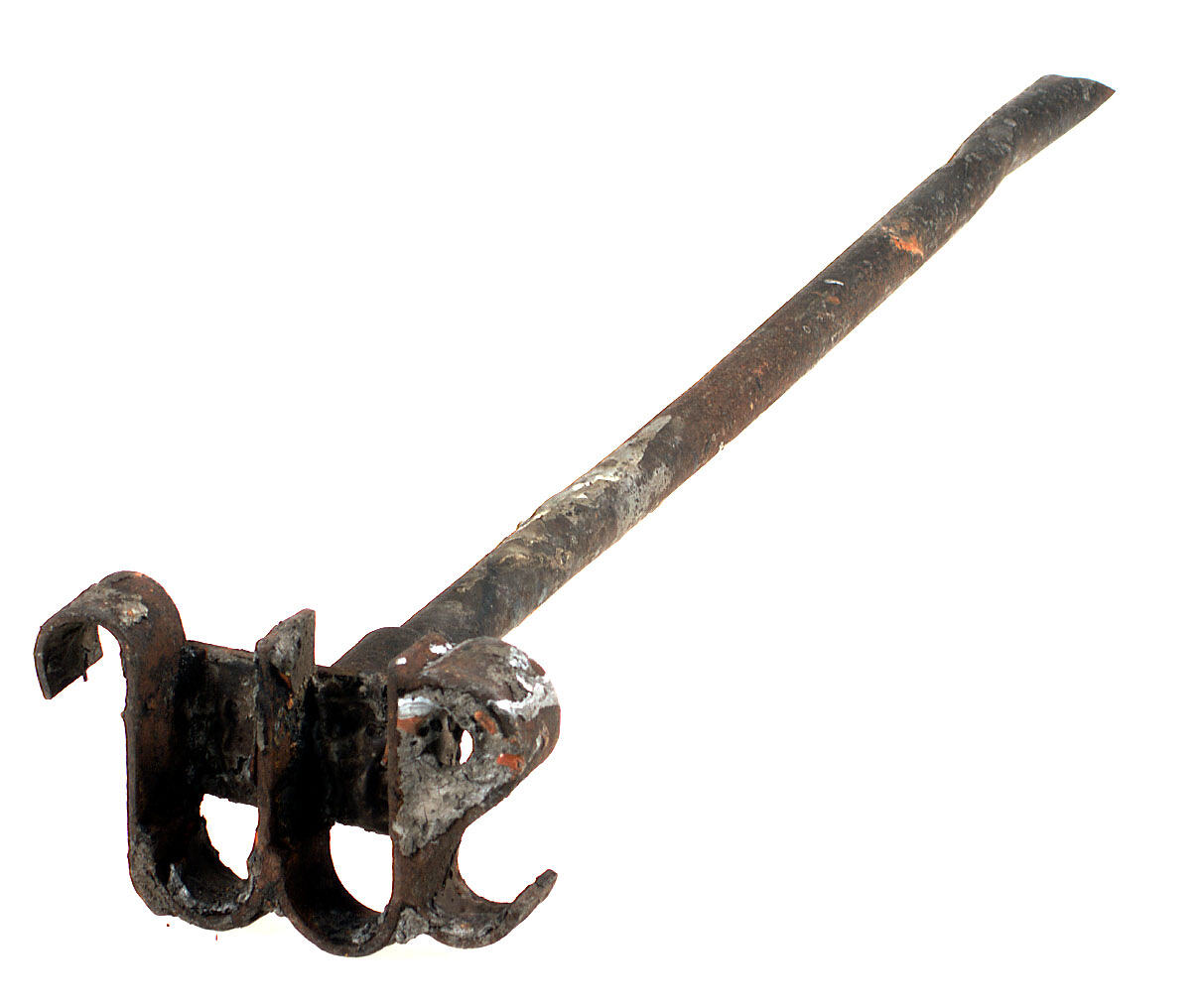 Branding iron. Used with silver paint. Round hollow shaft, welded onto a sleeve with "T" plate, onto which head is welded.