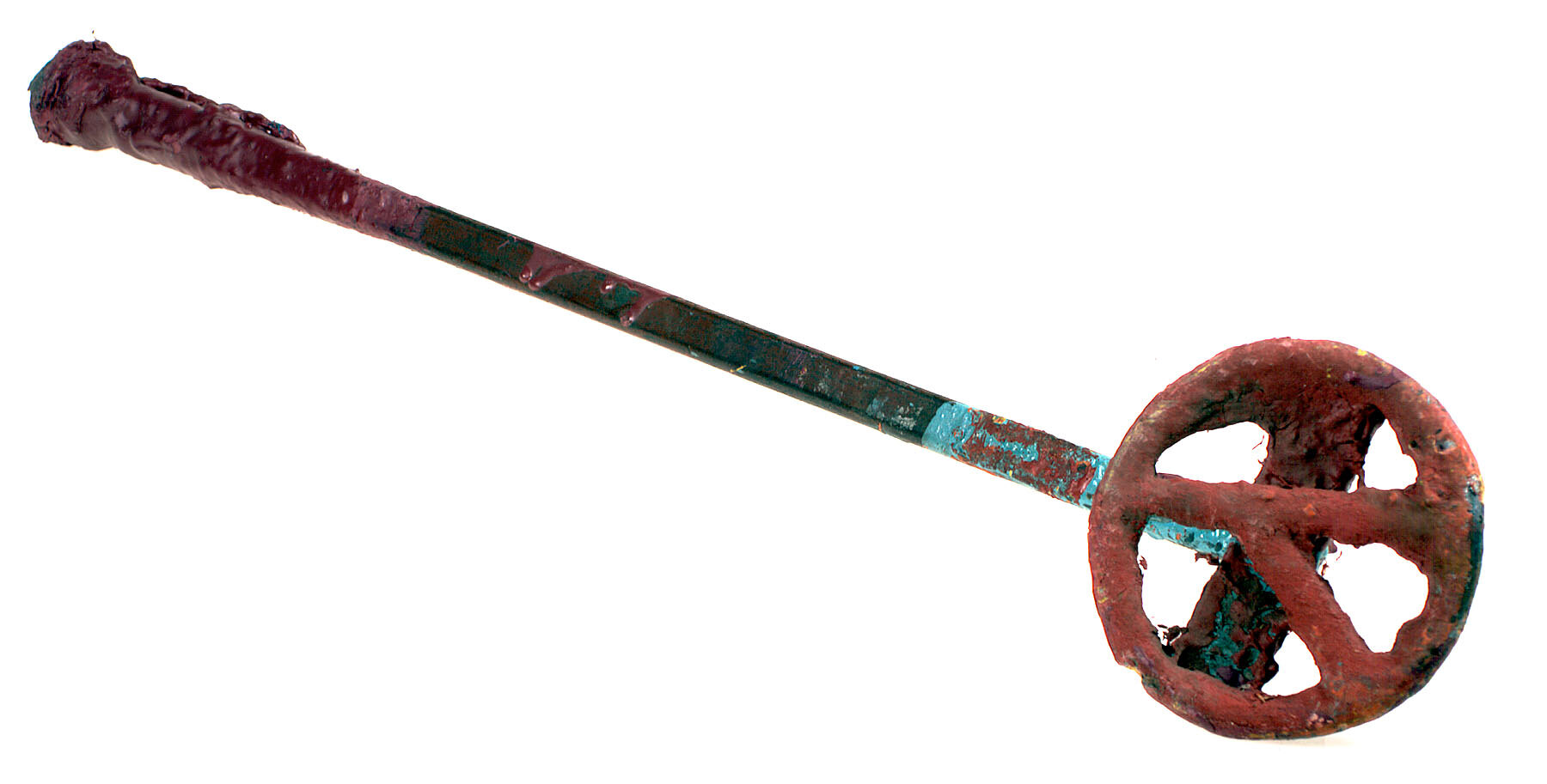 Sheep branding iron. Used with paint (yellow, red, pale blue and orange coloured paint are evident in layers down to base metal). Heavy metal square tube, supporting head at end with brand "Y" within a circle. It is bent near the connection and so may have been used from above. The end of the handle has also been used as a simple marker. Dark red/maroon waxy paint is built up in layers over end. White animal hairs are embedded in paint.