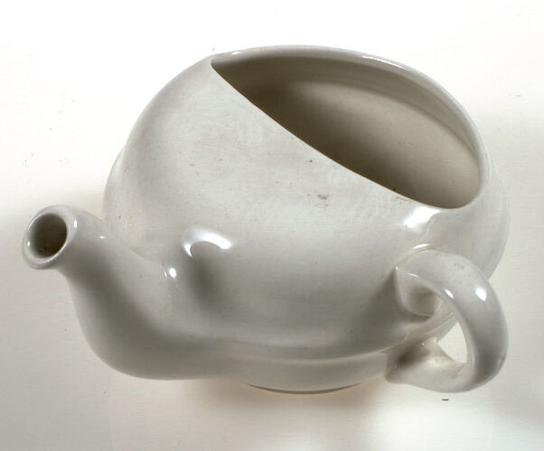 White ceramic invalid cup by Dunn Bennett & Co Ltd, circa 1935, used by patients in a psyhciatric hospital in Victoria Australia