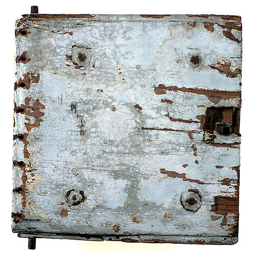 Wooden block consisting of a flat square piece of wood, rounded on one side, with a second piece of the same shape, but 1cm smaller all round bolted on top. There are thin strips of metal inset and nailed onto 3 sides. One of them looks like a door lock, but there is no keyhole. The top block of wood is covered with sheet-tin, painted pale green and has a rounded stud in each corner. Appears to be part of a reinforcement for a door fastening.