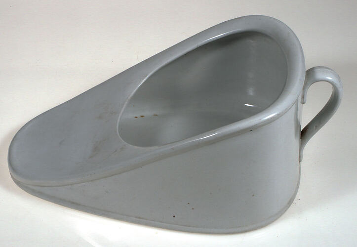 White ceramic slipper bedpan circa 1920 used in a mental health hospital in Victoria Australia.