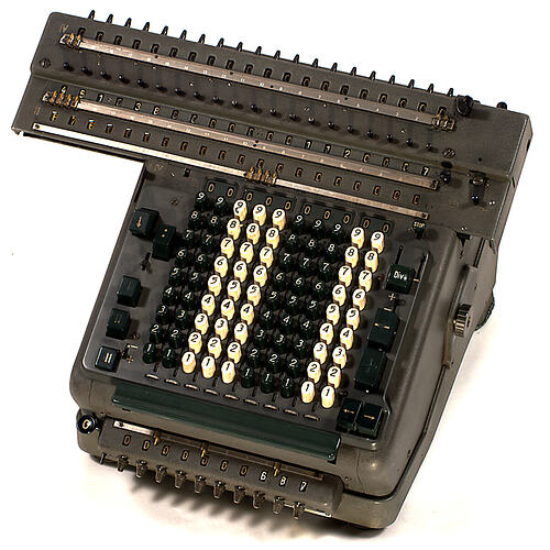 Electrified mechanical calculator, has a grey body with dark green and white keyboard. There is an electrical cord.