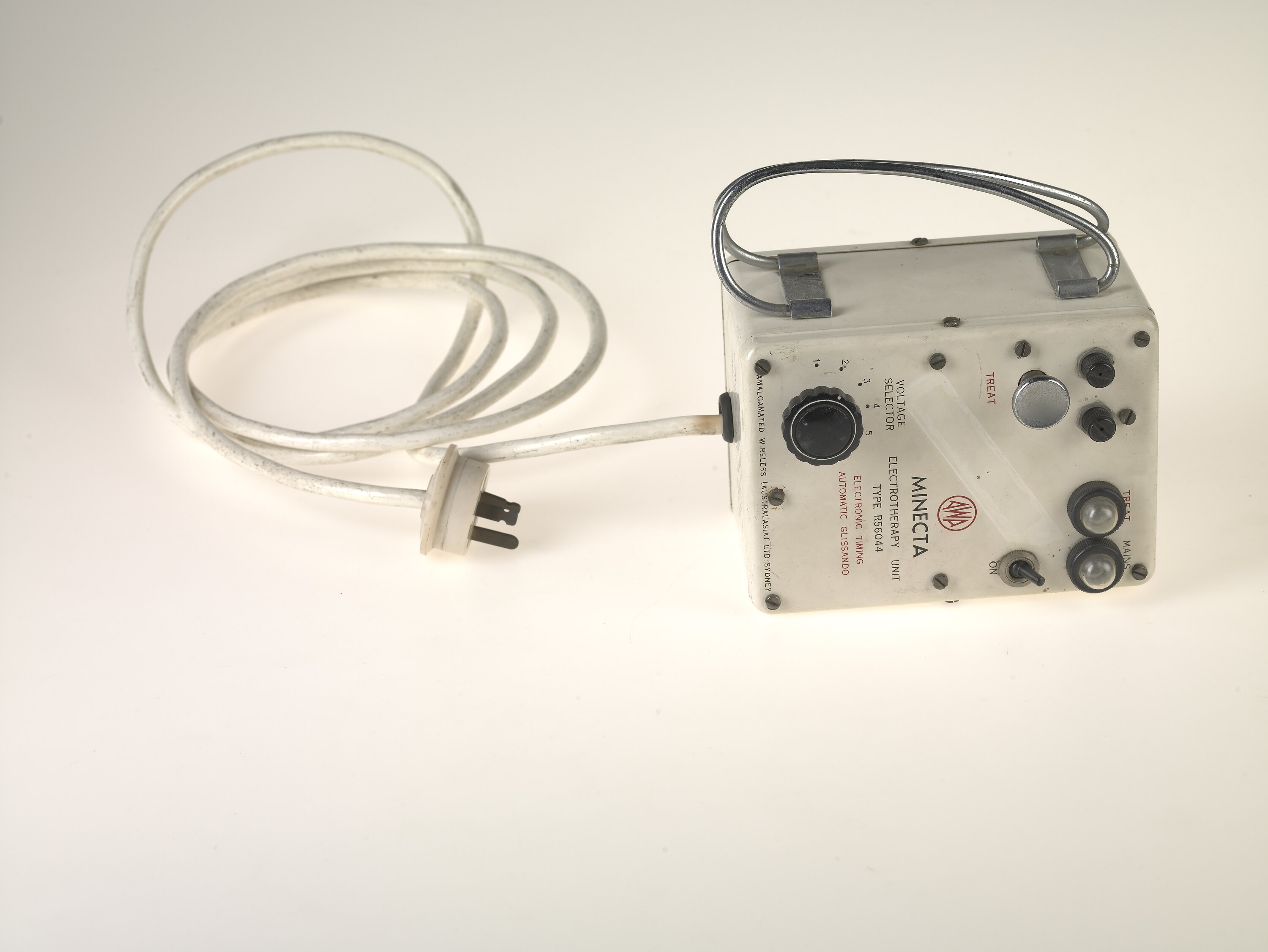 Electro-convulsive therapy unit (also known as electro-shock therapy unit), circa 1957. Used for electric shock treatment of patients in mental health hospitals in Victoria, Australia. Designed by Prof. Trethowan and Dr Bailey. Dr Bailey is also known for the development and practice of the controversial deep sleep therapy at Chelmsford, Sydney, in the 1960s-1970s. Made by Amalgamated Wireless (Australasia) Ltd., circa 1957.