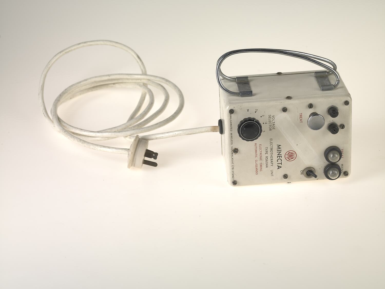 "A.W.A./MINECTA/ELECTROTHERAPY UNIT/TYPE R56044/ELECTRONIC TIMING/AUTOMATIC GLISSANDO"; "S2MG" engraved on base, "M8" scratched on base.