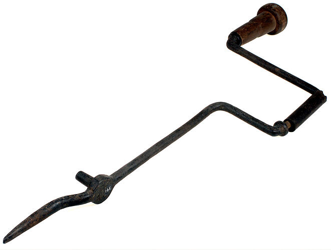 Hand Drill - Metal, Circa 1848. This drill was used for making holes in wooden posts for post and rail fences. Probably last used early this century, on one of the farms attached to a mental health hospital in Victoria, Australia